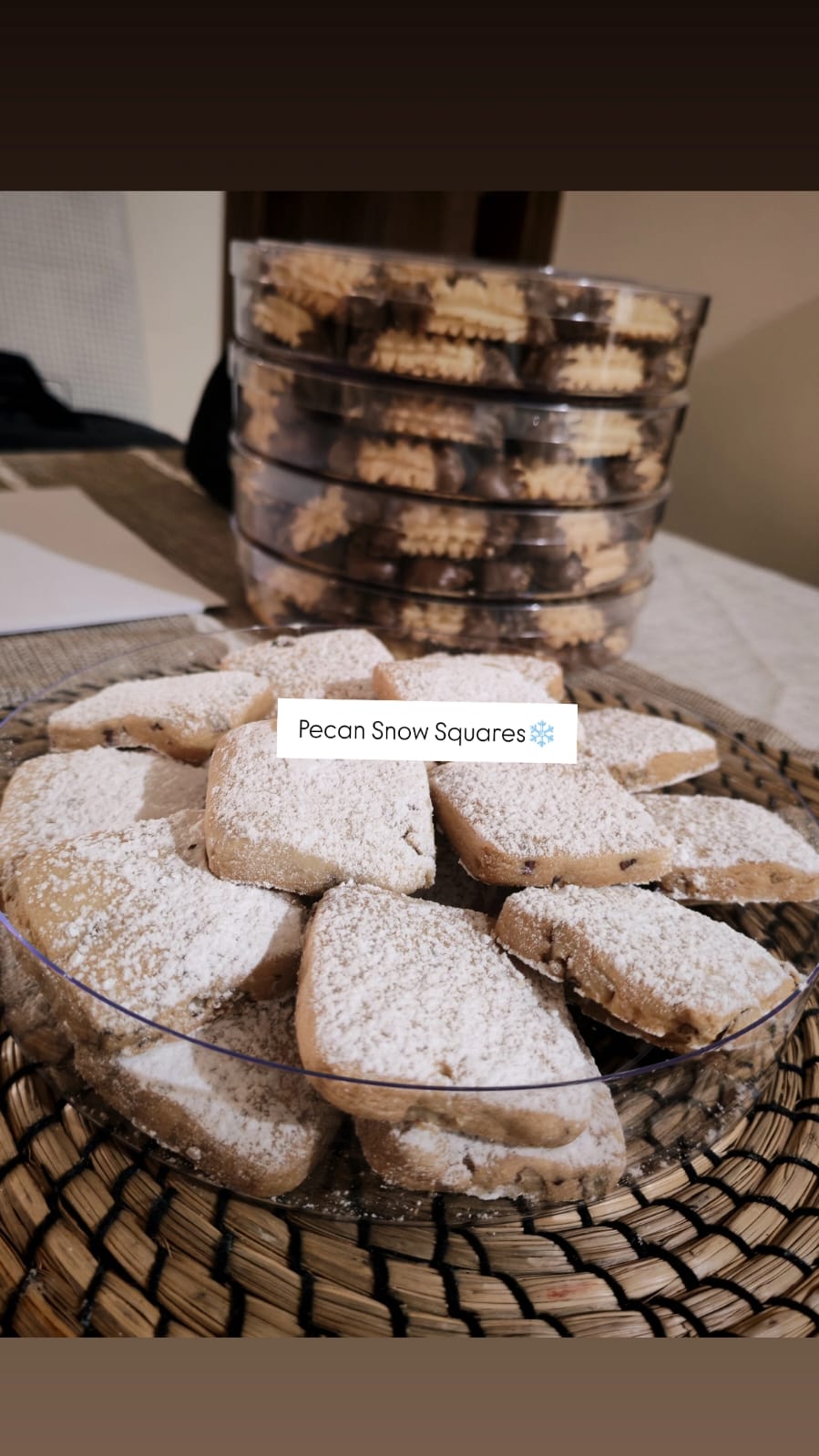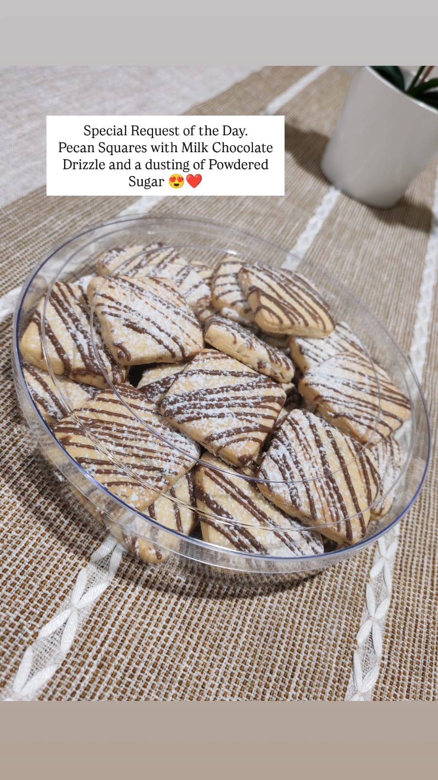 Elegant Pecan Squares with a milk chocolate drizzle and dusting of powdered sugar